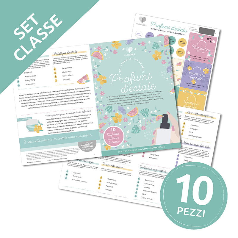 Gli spray aromatici per ambienti "Profumi d'Estate" sono un modo rapido, facile, comodo ed economico di utilizzare gli oli essenziali per migliorare l'esperienza estiva vostra e dei vostri cari, contribuendo anche alla salute e al benessere. Questo opuscolo contiene ricette per profumazioni deliziose, che troverete ottime da avere a portata di mano. Raccomandiamo di utilizzare i nostri flaconi spray da 120ml disponibili in vetro colorazione AMBRA e BLU (entrambi schermanti). Oppure adatta le quantità alla dimensione del contenitore spray che preferisci!