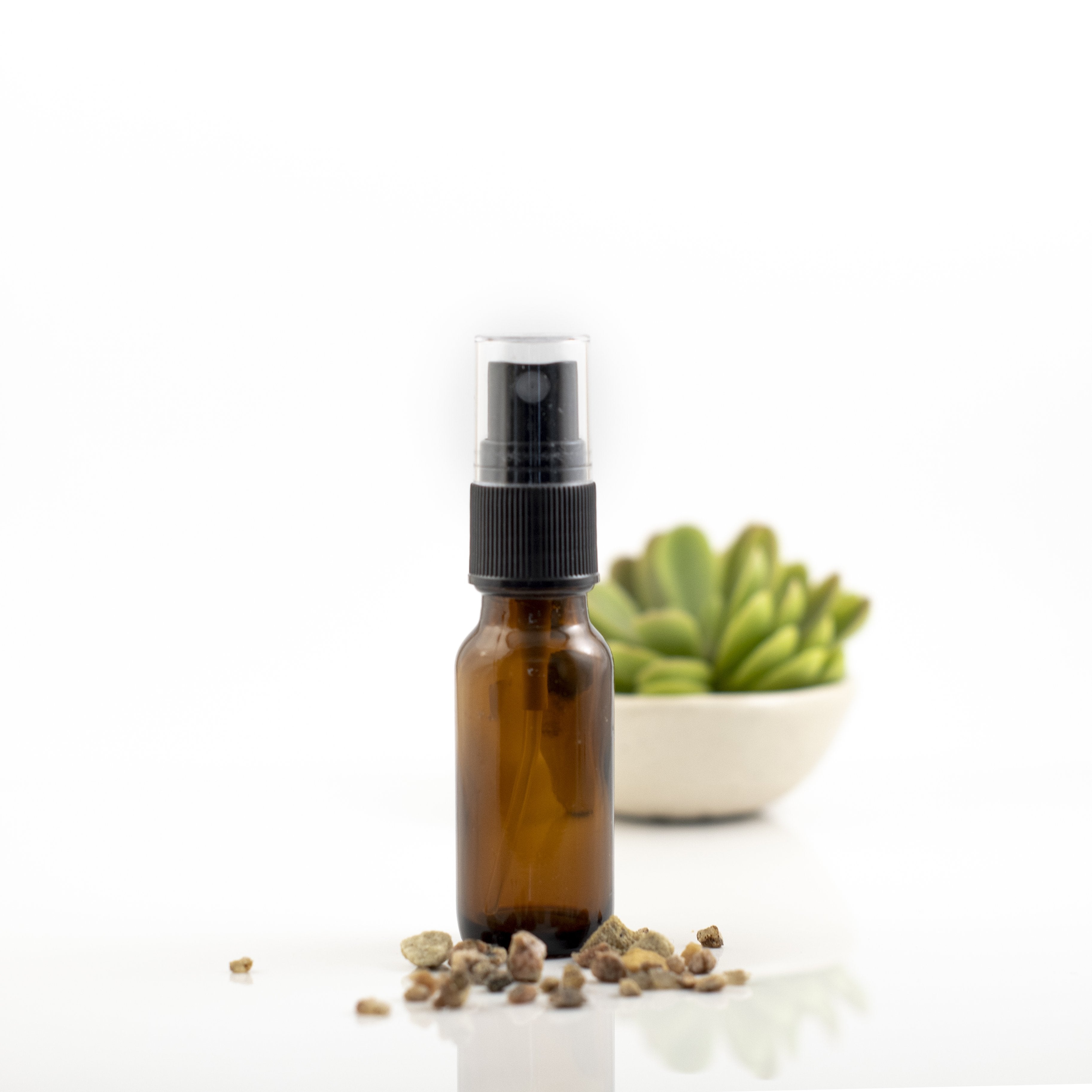 Questo flacone di vetro ambrato da 15 ml è dotato di un nebulizzatore a pompa nera e di un tappo di plastica trasparente per la protezione.