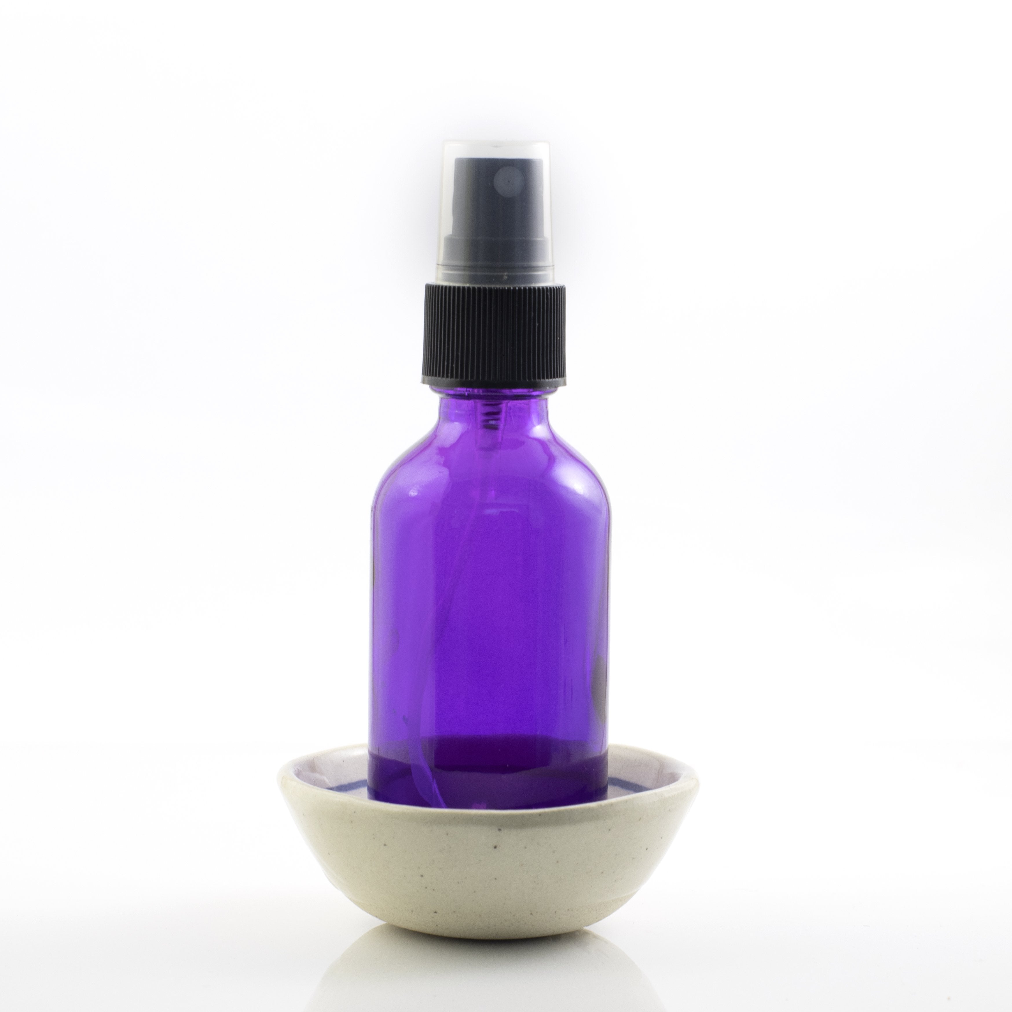 Queste bottiglie di vetro VIOLA da 60 ml sono dotate di una testina di nebulizzazione a pompa nera e di un cappuccio di plastica trasparente.