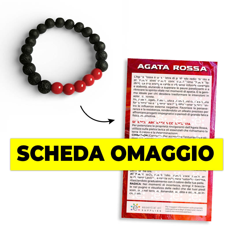 Applica 1-2 gocce di olio sulla pietra lavica, indossa e respira. Lascia che l'energia calda dell'Agata Rossa alimenti la tua forza interiore.
