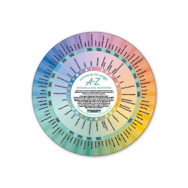 Con la Bussola dei Disturbi, avrai a portata di mano un elenco completo di 60 condizioni, ordinate alfabeticamente e riportate sia sul fronte che sul retro del dispositivo. Per ciascun sintomo, troverai in modo rapido gli oli o le miscele più adatte per la gestione di tale disturbo. Successivamente potrai approfondire a quale trattamento fare riferimento, nella Guida A-Z oppure nella sezione Protocolli del manuale.