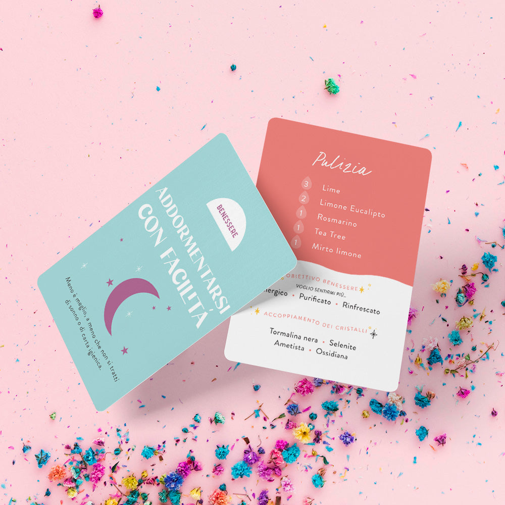 Hai un'emozione, uno stato d'animo o una situazione che ha bisogno di un piccolo aiuto? O forse desideri portare un po' di atmosfera stagionale nel tuo ambiente? Questo mazzo di carte contiene tante ricette che ti aiuteranno a trasformare l'ambiente nel quale vivi o lavori, facendoti ricavare il massimo dalla tua collezione di oli.