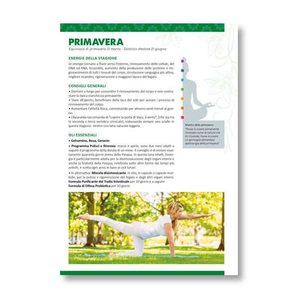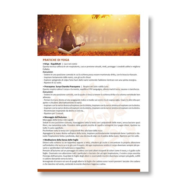 Nel terzo fascicolo avrai la possibilità di conoscere come unire pratica Yoga e aromaterapia, seguendo il ritmo delle stagioni. Per ogni stagione troverai il seguente schema: